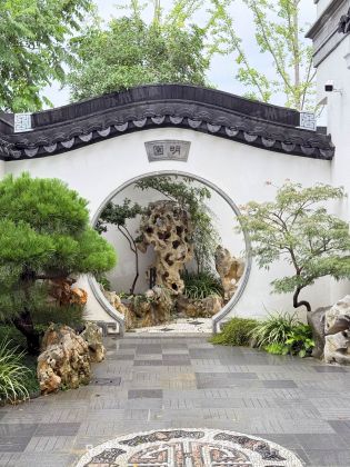 入口處一道圓潤的月洞門靜靜佇立,宛如一輪凝固的明月,溫柔地框住了門后的第一道風景——一塊姿態(tài)嶙峋、氣韻孤高的太湖石獨峰。瞬間將喧囂隔絕在外,只留下引人探尋的幽靜。